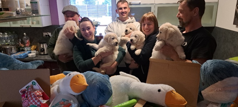 Byla to s 11 štěňaty jízda… ale myslím, že štěňátka šla do nových domovů výborně naučená na lidskou náruč a vše kolem domácnosti… s ohledem na počasí byl venek horší, ale podle zpráv již každý brázdí okolí svých nových domovů…
